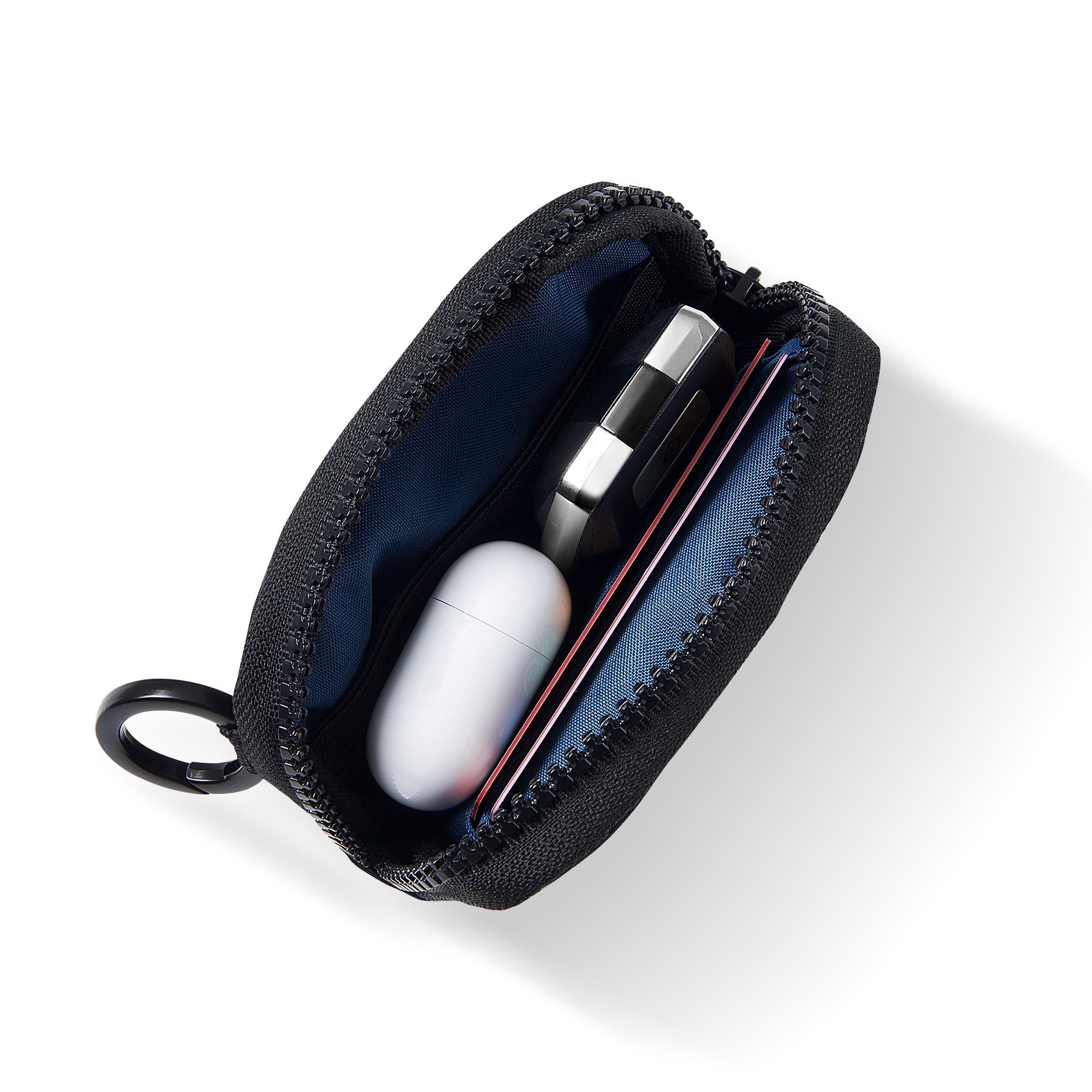 Inside, you’ll find two dedicated card slots and a mesh pocket for coins or small items. A bold blue inner lining adds a striking pop of color to your everyday carry. Clip it onto the