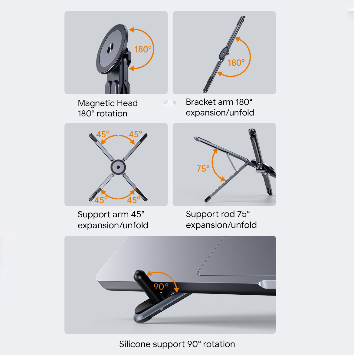 Upgrade your workspace with this versatile laptop & phone stand. Designed for flexibility and convenience, it functions as a laptop stand, phone stand, and even a tripod. The adjustable laptop angle helps reduce wrist tension for comfortable all-day use, while the phone stand offers a 180° rotation for optimal viewing. It also features a MagSafe-compatible mount and includes a magnetic ring for non-MagSafe users. Compact and multi-functional — a smart gift choice for modern professionals.