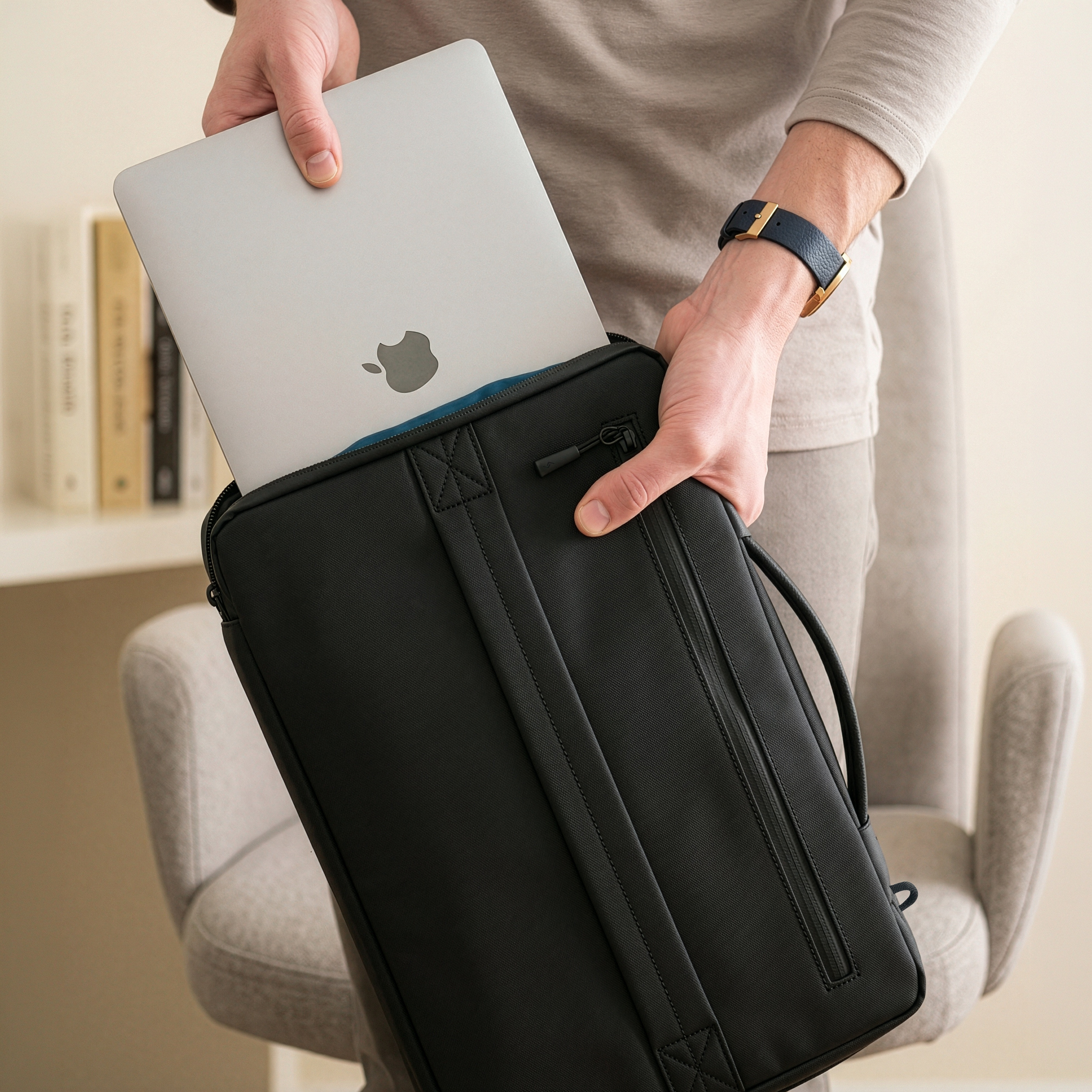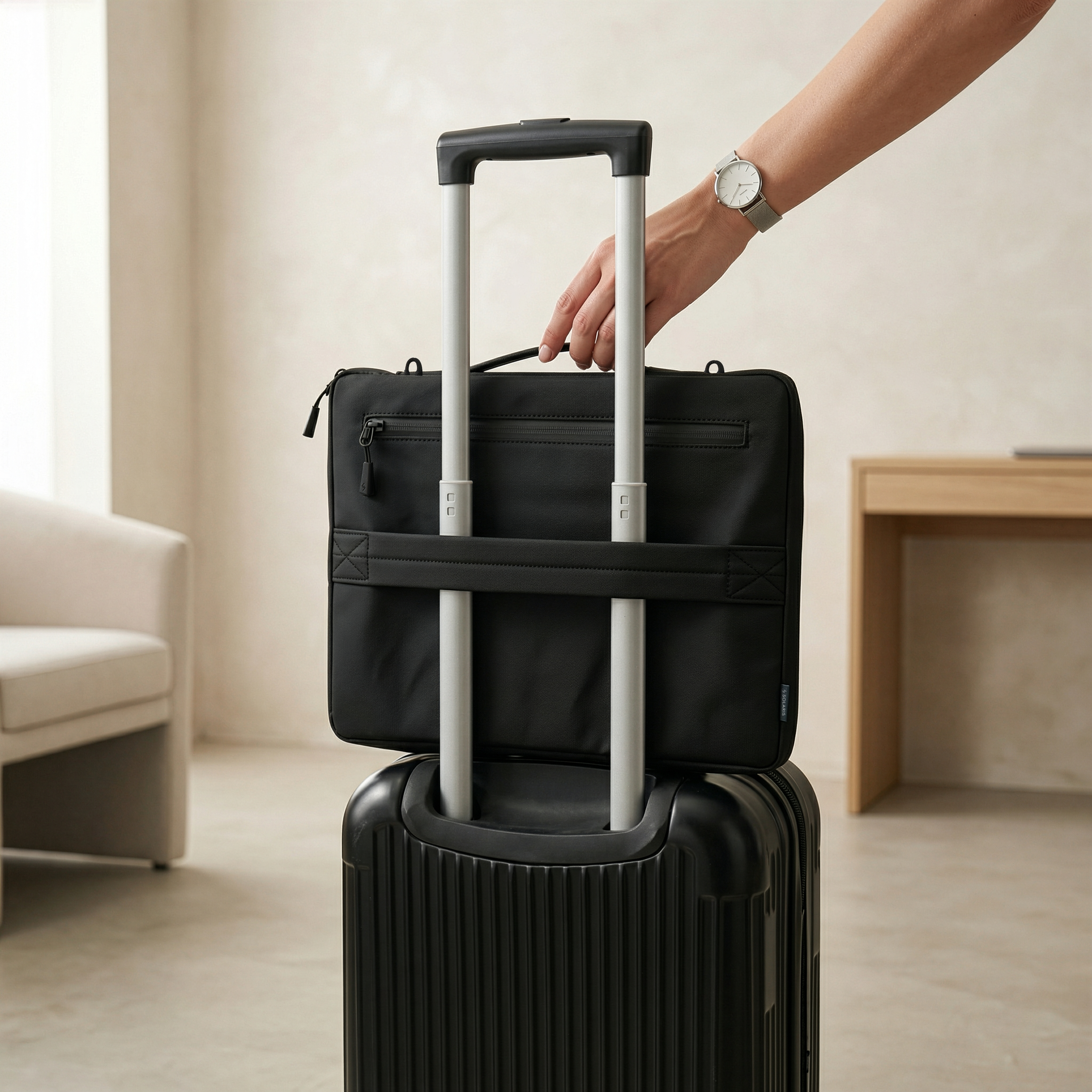 A seamless retractable top handle gives you the flexibility to carry it by hand or use it as a streamlined sleeve when not in use. The sideways zip opening allows quick access, while a side zipper compartment keeps chargers and essentials organised.