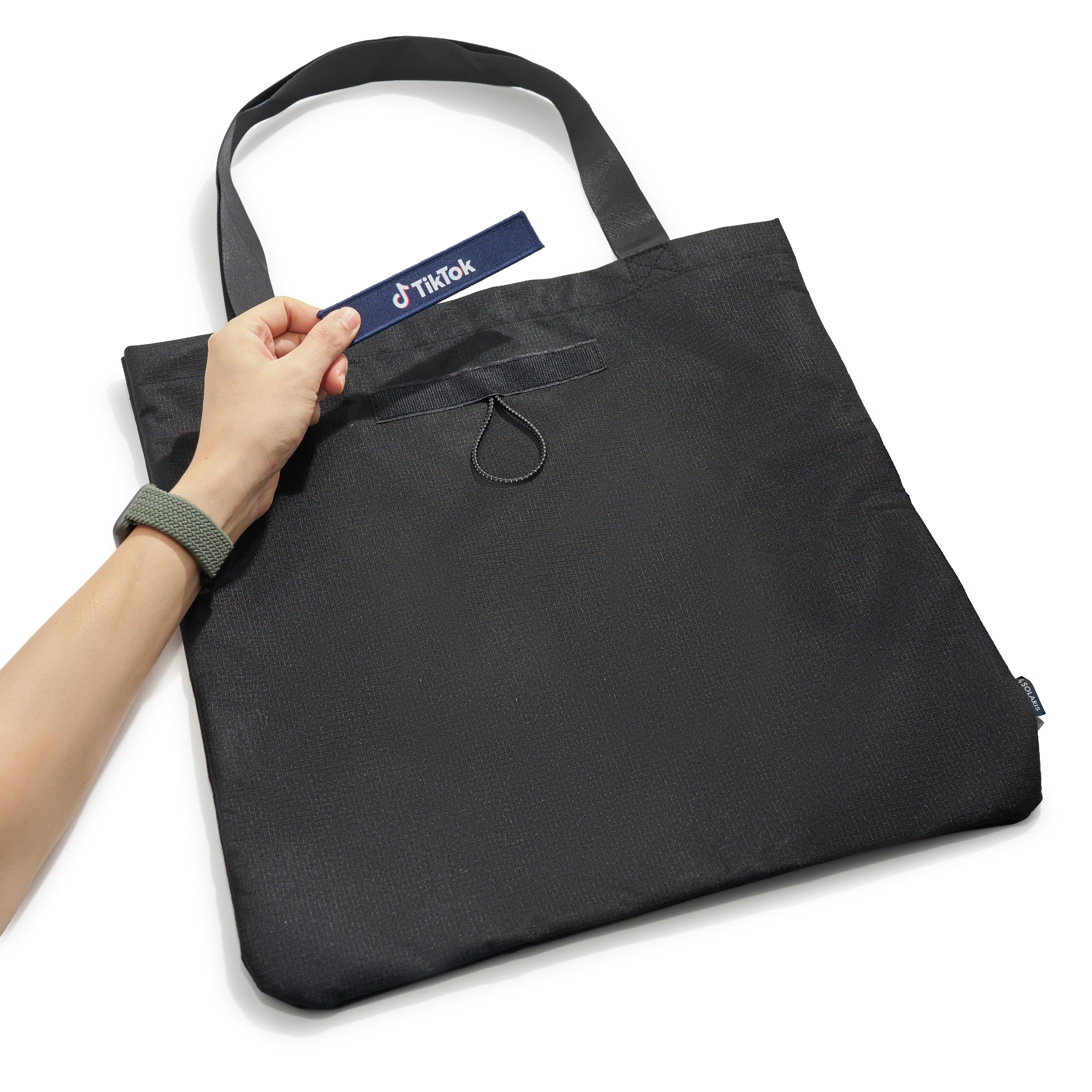 When you're finished, the tote effortlessly rolls up and secures with its integrated elastic band, ensuring portability and tidiness. An exterior velcro tab provides a prime spot for branding, making this lightweight partner a seamless extension of your daily rhythm.